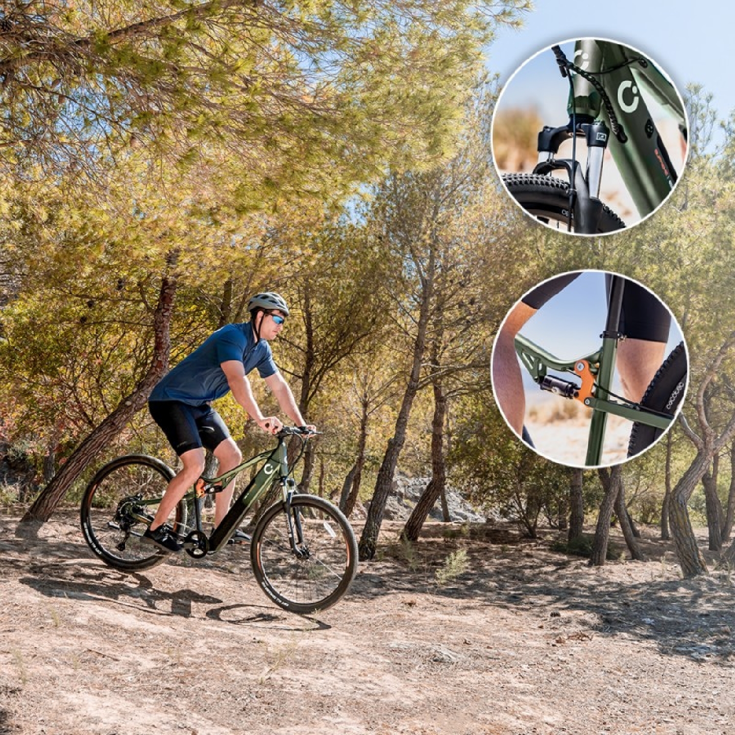 Bicicleta eléctrica de montaña 29″, con 120Km de autonomía , doble suspensión, cambio Shimano Cues de 10 velocidades y doble disco de freno hidráulico Tektro.