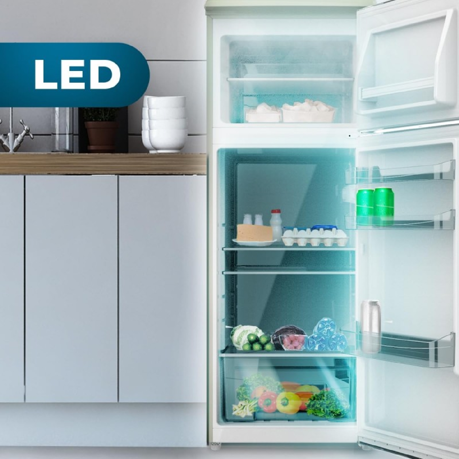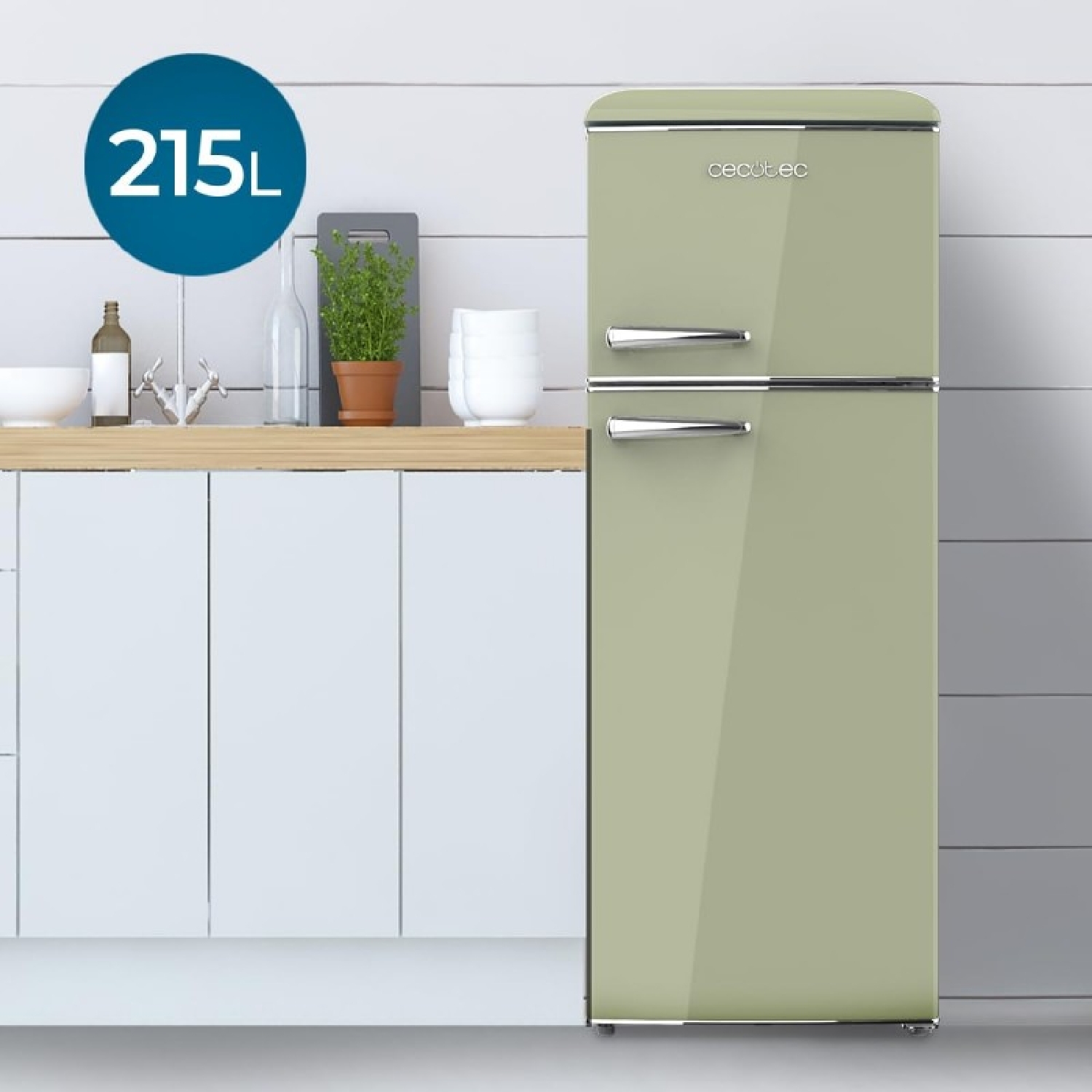 Frigorífico retro de dos puertas verde azulado de 148,2 cm de alto y 55,2 cm de ancho con capacidad 215L, clase energética E, iluminación interior y tirador cromado.