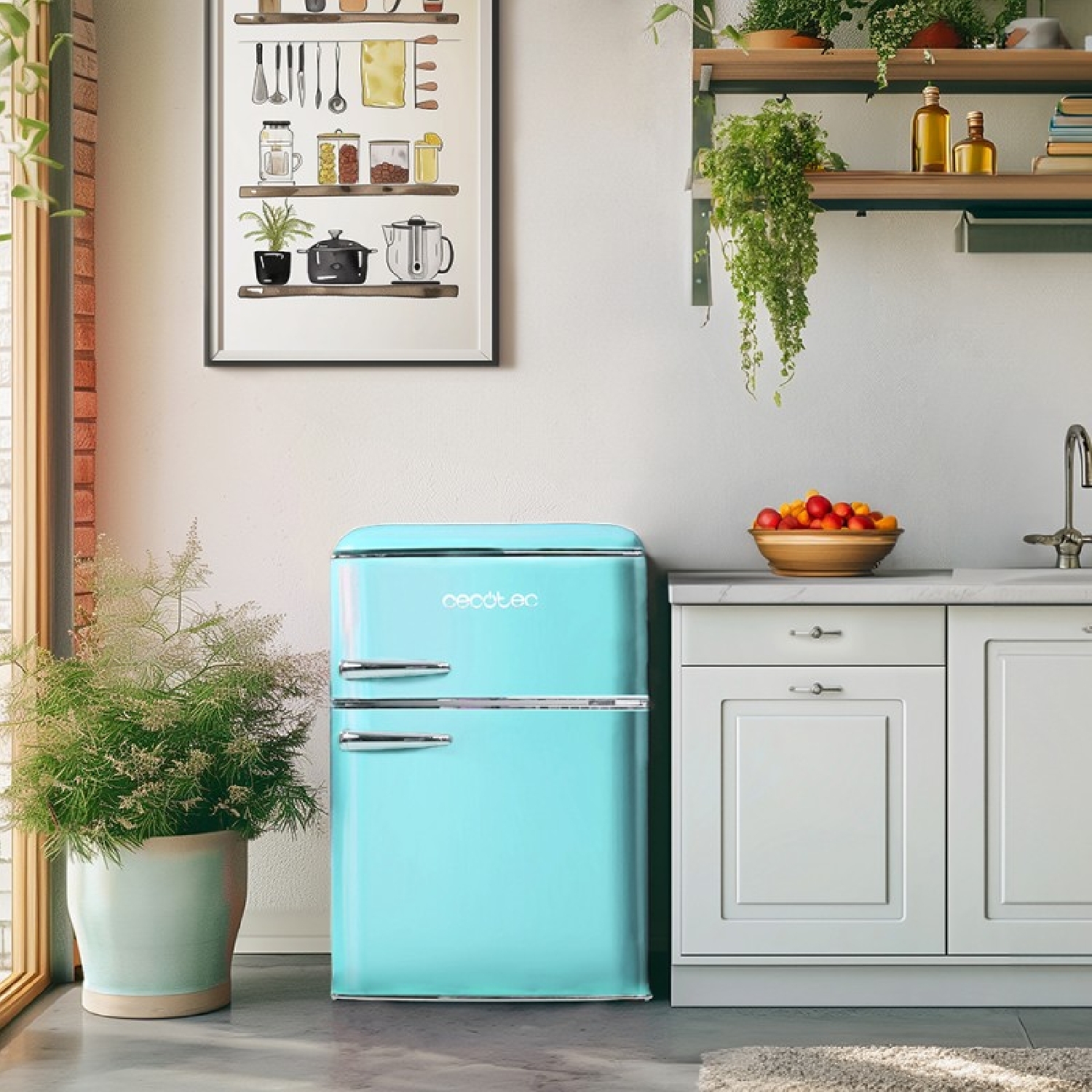 Mini frigorífico retro de dos puertas azul de 89,3cm de alto y 48,7 de ancho con capacidad de 86L, clase energética E, LED interior y tirador cromado.