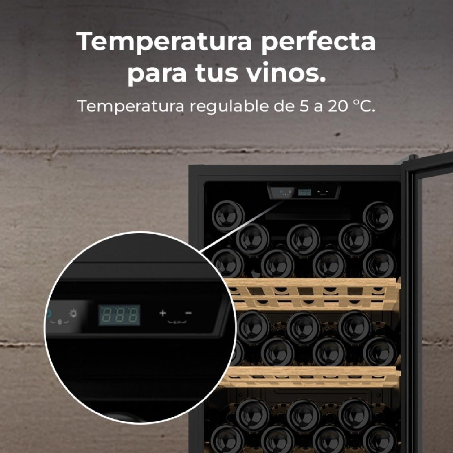 Vinoteca grande 98 botellas, Compresor Silencioso 37dB, Dimensiones 128.5cm alto x 48cm ancho, Control táctil, Temperatura regulable 5ºC a 20ºC, Bloqueo infantil, Luz LED interior
