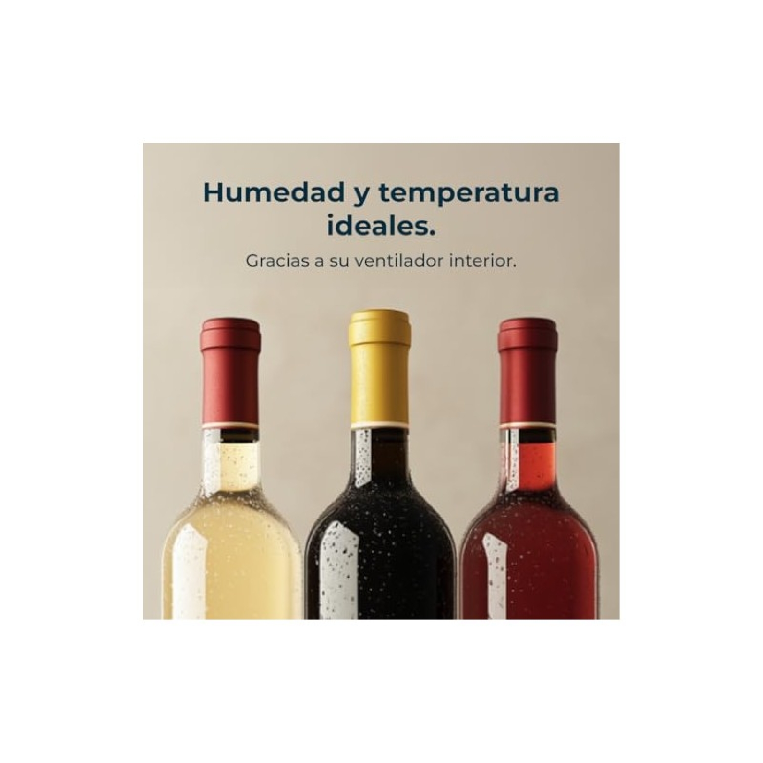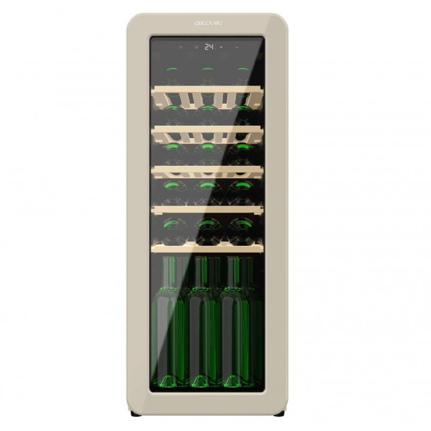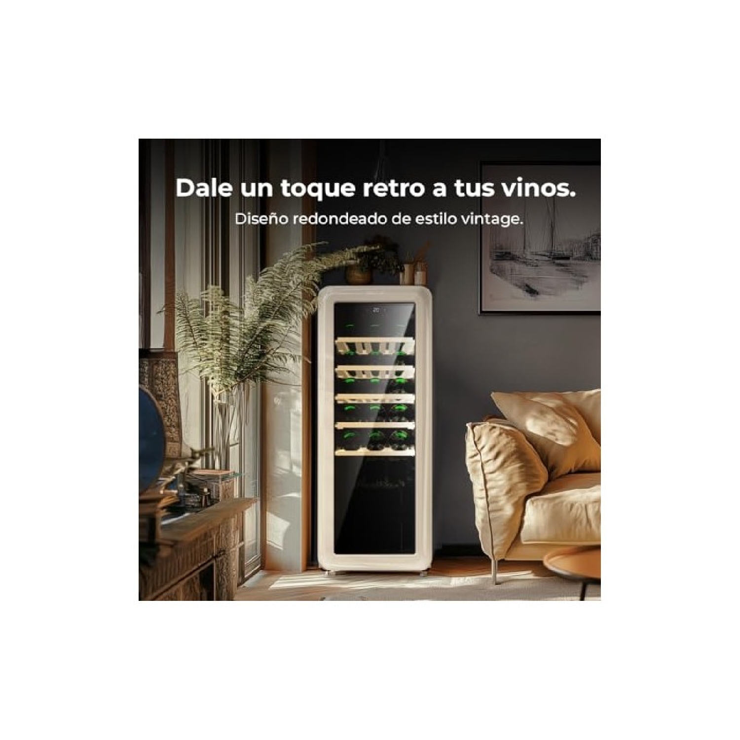 Vinoteca de diseño retro color beige, Capacidad para 24 botellas, Control electrónico de temperatura mediante display LED, Rango ajustable de 5 a 20ºC, Tecnología NoFrost, Estantes madera, Luz interior, Ventilación interna asistida por ventilador, Dimensiones de Alto 92,8cm, Ancho 36,6cm, Fondo 47,6cm