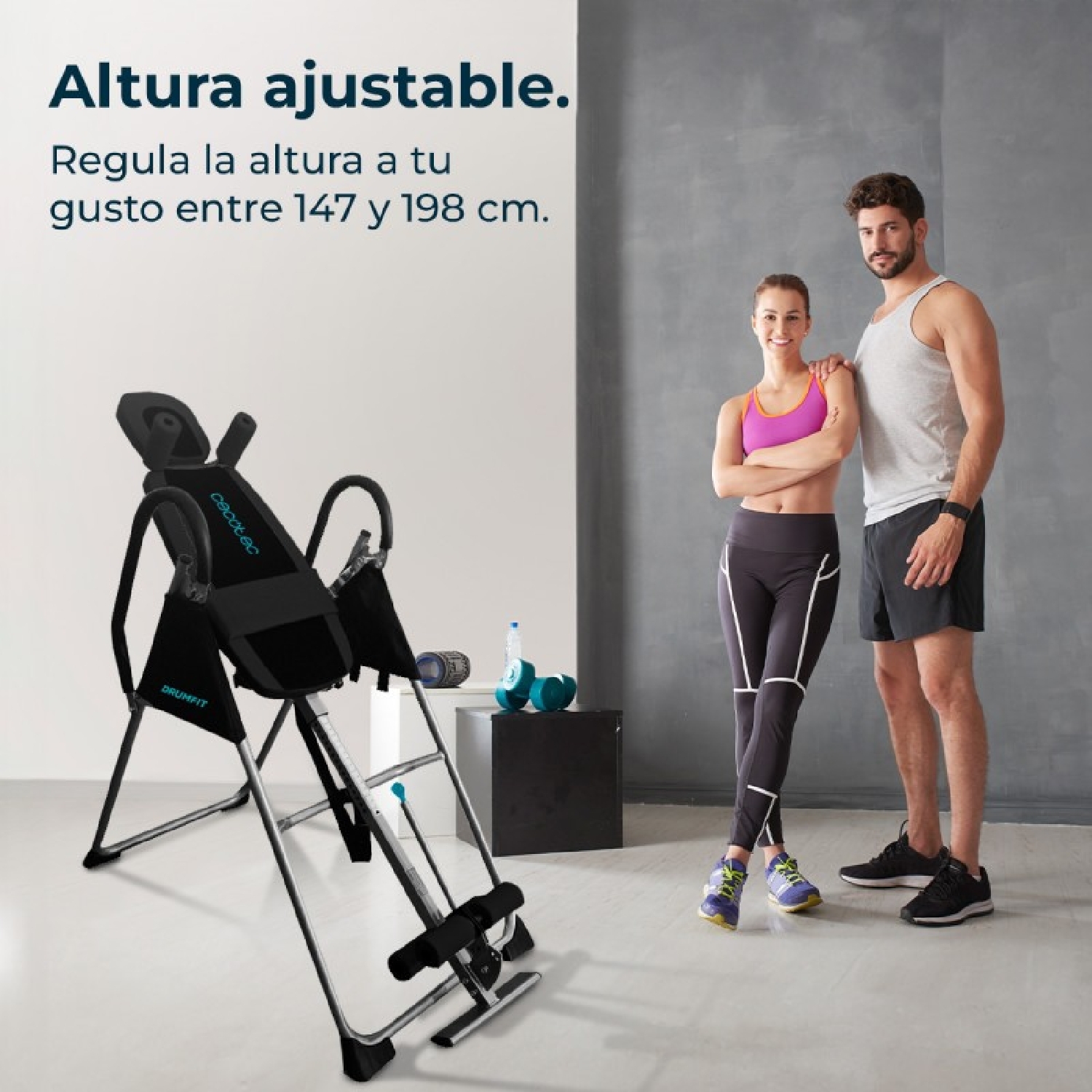 Tabla de inversión plegable con inversión total. Cinturón y almohadillas de seguridad. 26 niveles ajustables. Altura ajustable entre 147 y 198 cm.