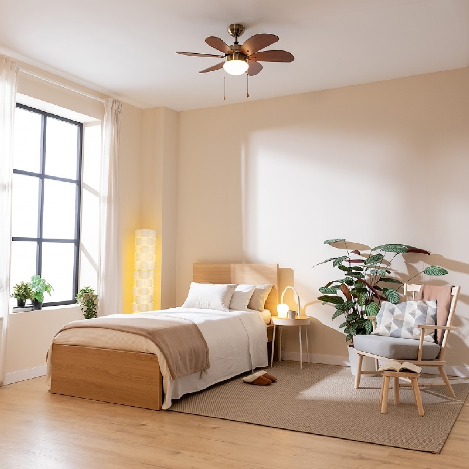 Ventilador de techo de 50 W y 36” con lámpara, 3 velocidades, 6 aspas reversibles, modo winter-summer y uso sencillo.