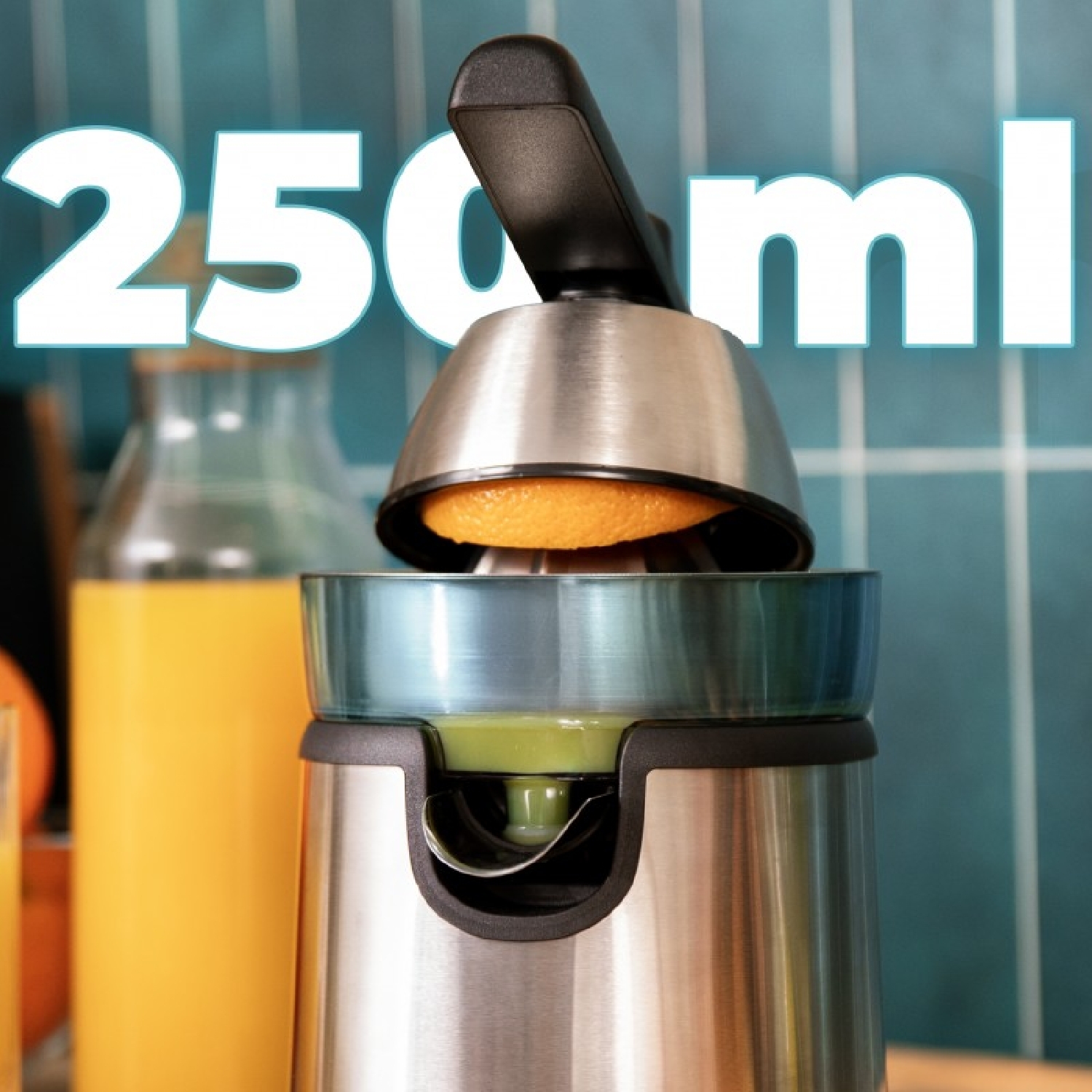 Exprimidor eléctrico de brazo para naranjas y cítricos con 120 W de potencia y dos conos desmontables de diferente tamaño, el grande de acero inoxidable y el pequeño de plástico. Filtro de acero inoxidable. Con una capacidad de 250ml.