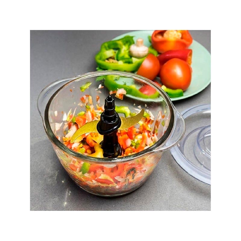 Picadora eléctrica compacta con cuerpo de acero y cuchillas con recubrimiento de titanio.