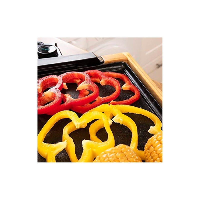 Plancha de asar eléctrica de 2000 W, con estructura de bambú, termostato regulable y placa de asar antiadherente con superficie mixta mitad grill y apta para lavavajillas.