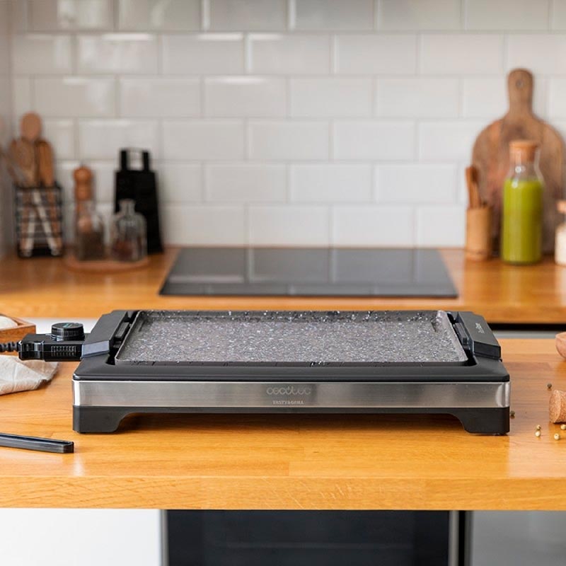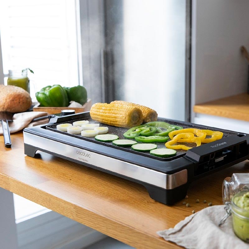 Plancha de asar eléctrica de 2000 W, con estructura de diseño y con acabados en acero inoxidable. Termostato regulable y placa de asar antiadherente con superficie de plancha, revestimiento RockStone y apta para lavavajillas.