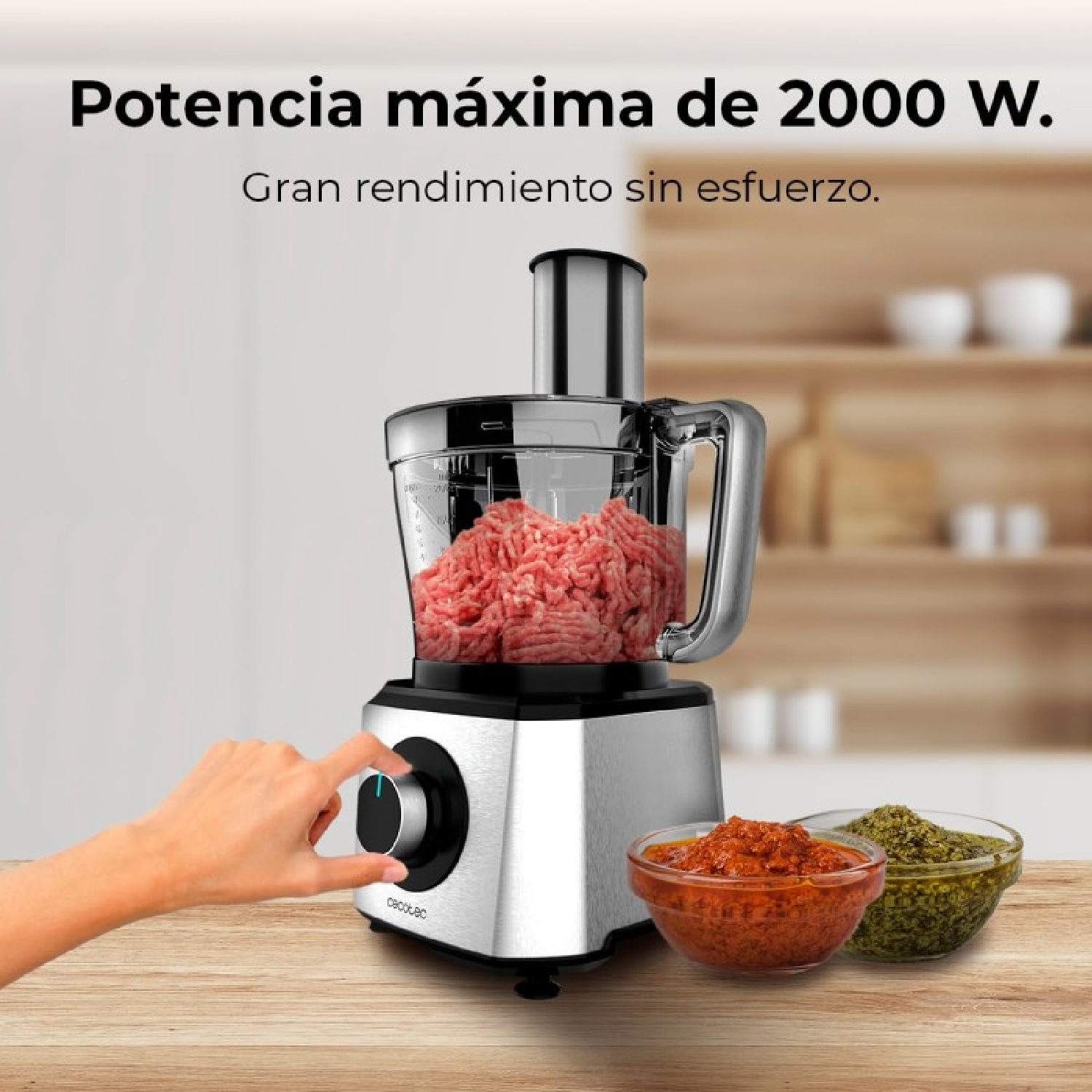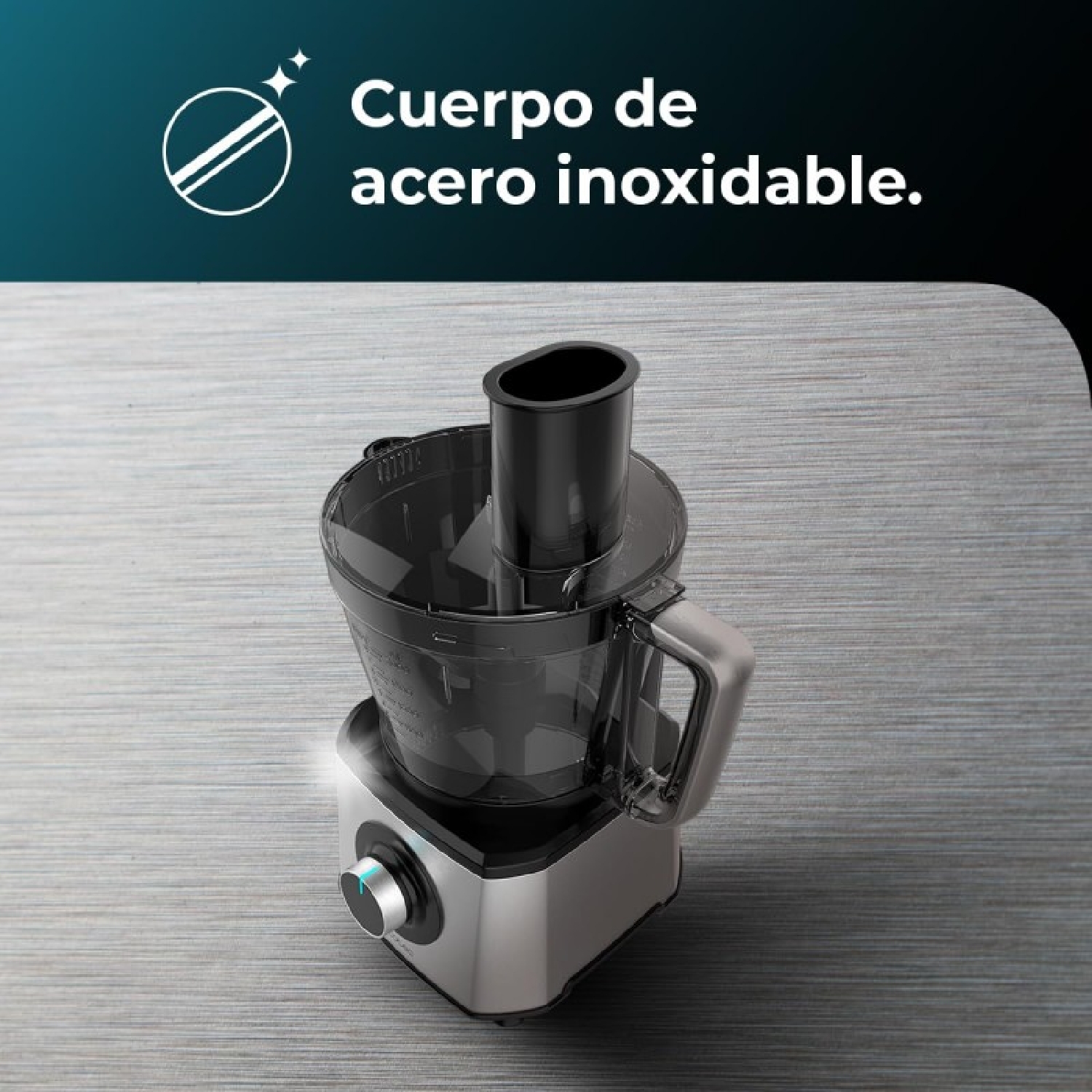 Procesador de alimentos con potencia máxima de 2000 W, cuerpo de acero inoxidable, 2 velocidades y pulse. Incluye bowl de 3,5 L. Accesorios: 3 discos de corte, cuchilla para picar y cuchilla para amasar.