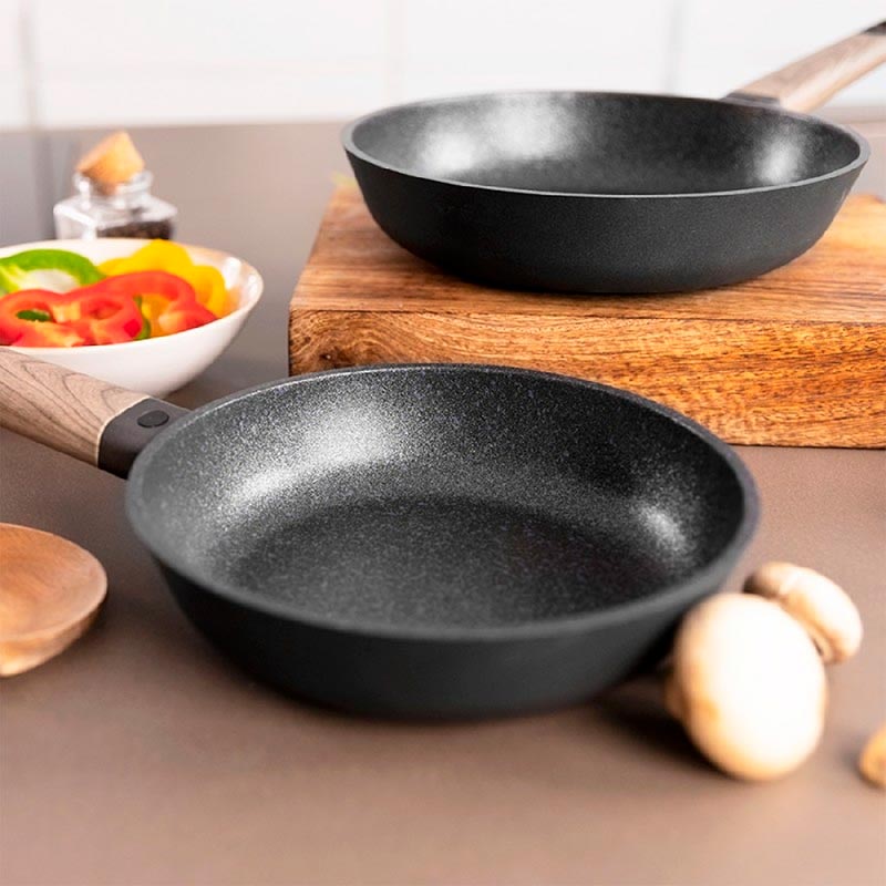Set de Sartenes de 20-24 cm de aluminio fundido de alta calidad, cuenta con 6 capas y revestimiento de máxima antiadherencia Teflon™ Nonstick Coating, libre de PFOA, con fondo difusor de calor Full Induction, aptas para lavavajillas y para todo tipo de cocinas incluida la de inducción.