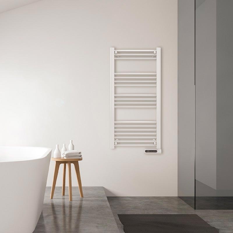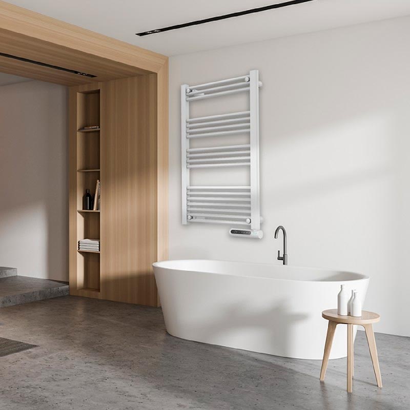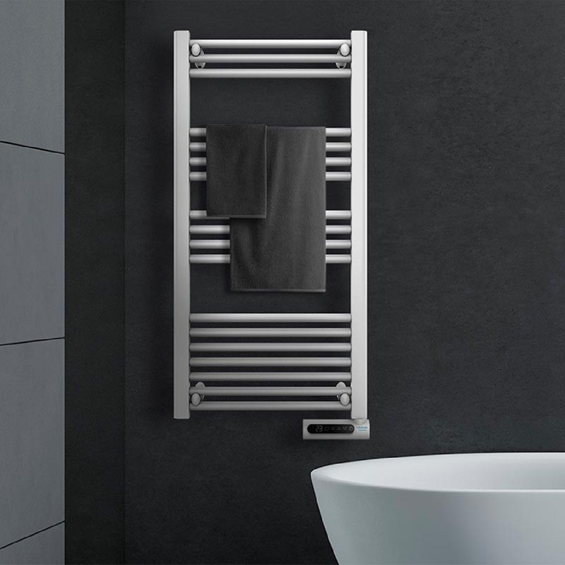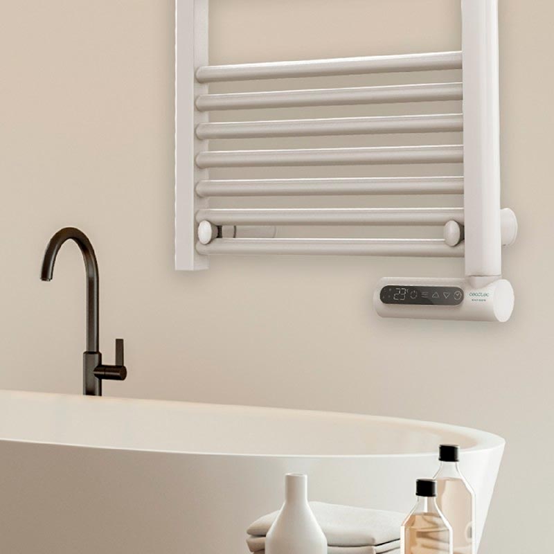 Toallero eléctrico de fluido con 750 W, pantalla LED, control táctil, programador semanal, 3 modos, temperatura seleccionable, y máxima seguridad con IP24.